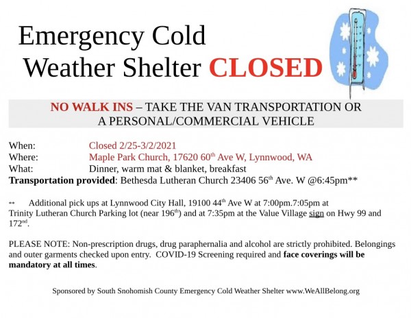 - Emergency Cold Weather Shelter is Closed, 2/25-3/2/21